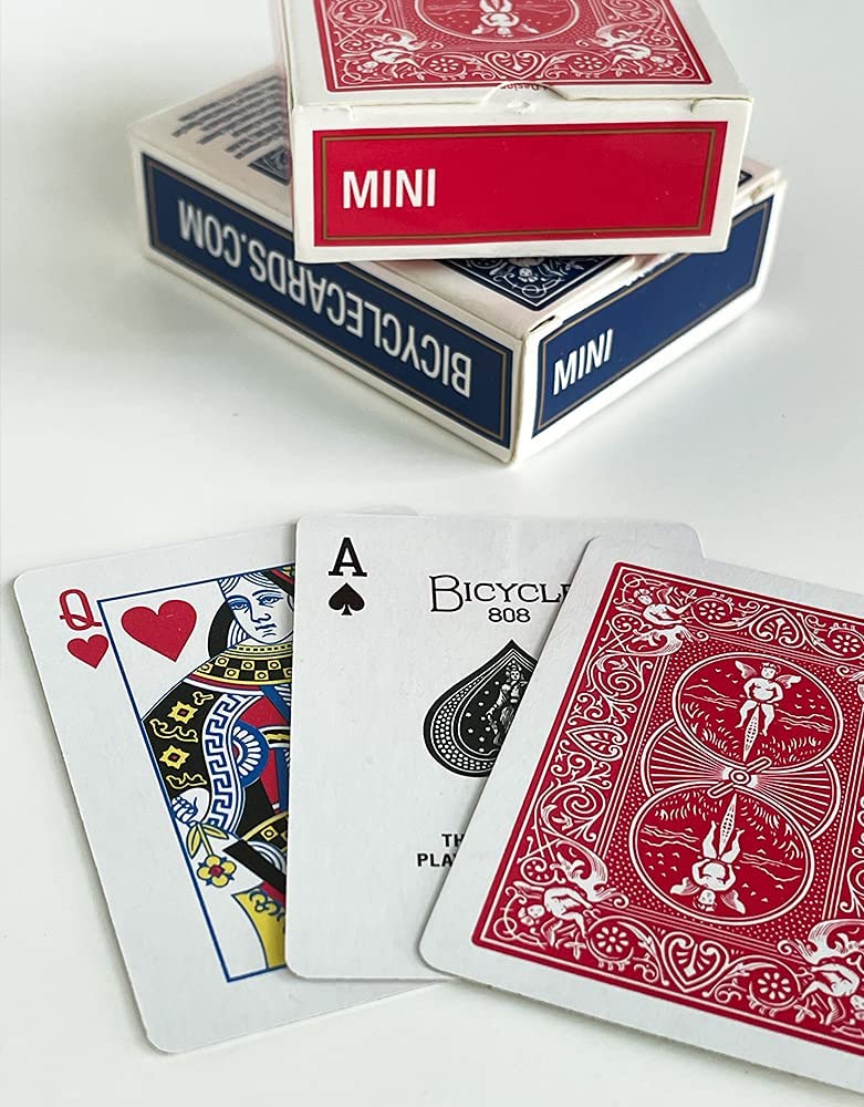 Small enough to fit your pocket, these Bicycle Mini Rider Back Decks are the perfect choice for travel-sized card games and everyday play. Whether you prefer red or blue, these 2.5" x 1.8" playing cards feature the traditional Rider Back design. Great as gifts and stocking-stuffers, they make wonderful party favors, birthday gifts, and more.